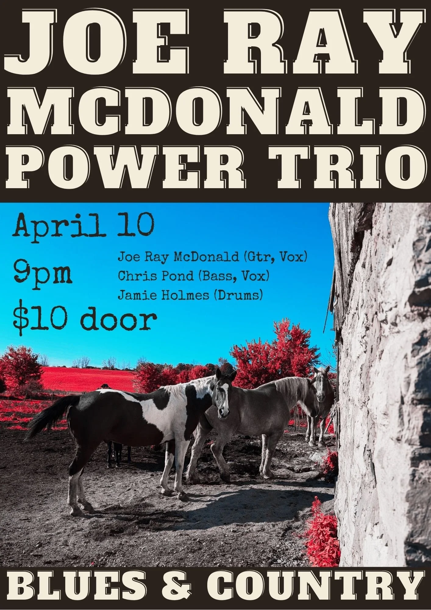 Back to All Events The Joe Ray McDonald Trio Friday, April 10, 2026 9:00 p.m. 11:55 p.m. Google Calendar ICS Click here to buy ticketsSell tickets online with Ticket Tailor